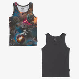 A two-pack of grey-blue vests for boys by Molo, made from super soft organic cotton jersey. Great for casual layering, one vest has a plain design, and the other has a beige smiling face print.