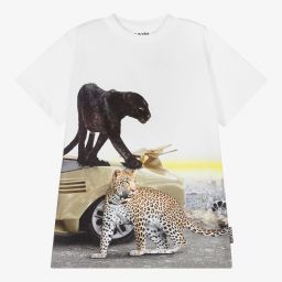 Ivory T-shirt for boys by Molo, made in soft organic cotton jersey. In orange, yellow and grey, the front illustration depicts a tiger drinking at a watering hole.