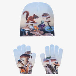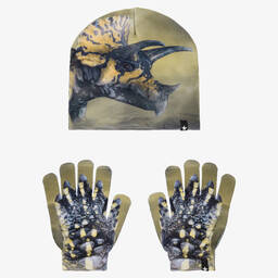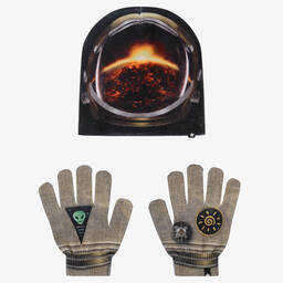 Navy blue beanie hat and gloves set for boys by Danish brand Molo. Made in a soft and stretchy fine knit, both pieces are patterned with cool UFOs in space graphics and the hat is lined for added warmth.