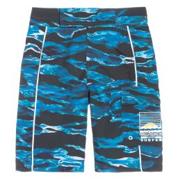 Boys blue and red swim shorts with a black palm tree print by Molo, made from recycled polyester. They have a velcro fastening waistband, mesh lining and pockets on the sides. There is a white 'Hawaii surfer' print on the leg.