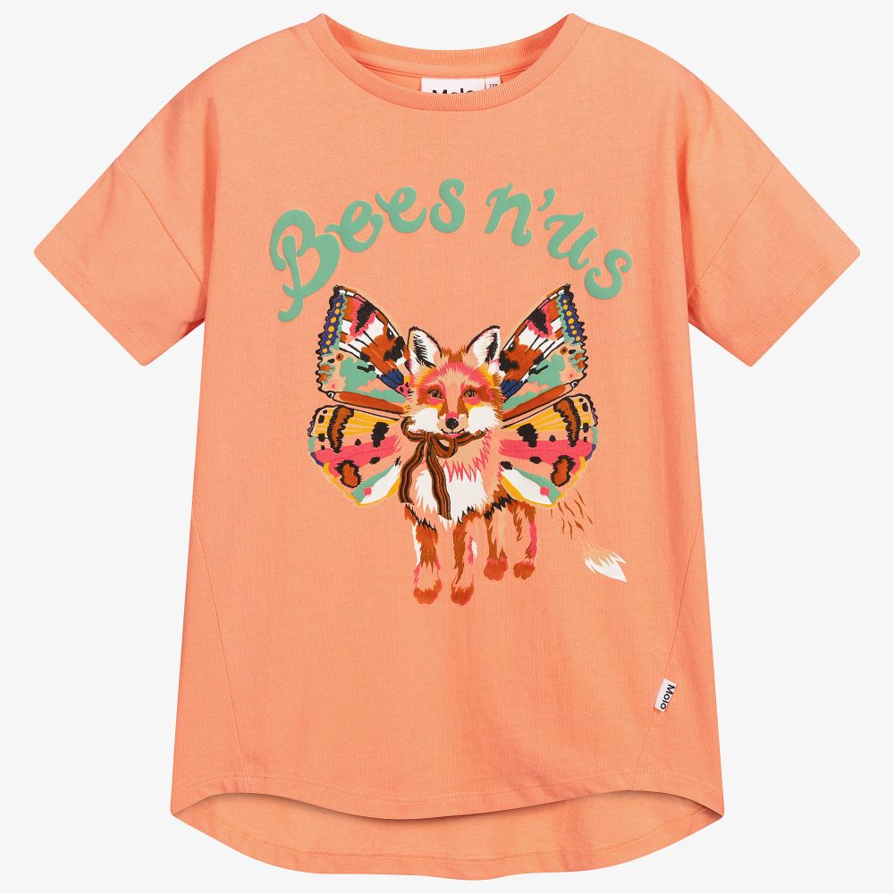 Coral pink T-shirt for girls by Molo, made in soft and stretchy cotton jersey. It has a fun fox print with colourful butterfly wings, and 'Bees n' Us' in aqua green above. The side seams are shaped and there is a dipped hem at the back.