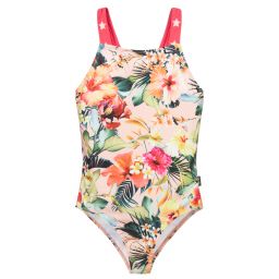 A coral pink swimsuit for girls by Molo, with a UPF factor of 50+. The soft and stretchy lycra fabric is made from recycled plastic bottles and has a colourful floral cat print. There are contrast bright pink shoulder straps with a star print.