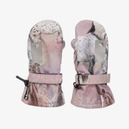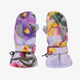 Beige floral ski mittens for girls by Molo provide both style and functionality on the slopes. Crafted with warm insulation and lined with soft polar fleece, these mittens ensure maximum comfort and warmth. The waterproof and windproof design features slip-resistant palms and reflective trims for safety. Adjustable velcro cuffs and a handy clip enhance usability. Last chance to buy, as quantities are limited.