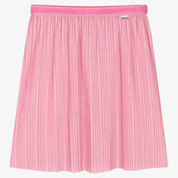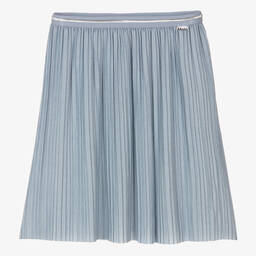 Blue pleated skirt for girls by Danish brand Molo, made in a soft and stretchy glitter fabric. Fun and functional, this skirt has an elasticated waistband with a silver stripe and a tag logo attached.