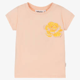 A pretty pale blue T-shirt for girls by Danish brand Molo, made in soft organic cotton jersey. This classic crew neck style has pink and yellow smiling face appliqué, with a tag logo on the side.