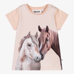 Ivory T-shirt for little girls by Molo, made in soft organic cotton jersey. The front is printed with a gorgeous grey kitten, with purple and yellow flowers. There are useful popper fastenings on one shoulder.