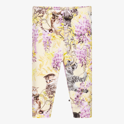 Ivory leggings for little girls by Molo, made in soft and stretchy organic cotton jersey. Full length, they are patterned with exotic wildlife in a green jungle.