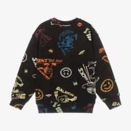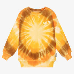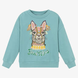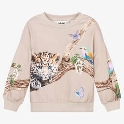 Fun pink organic cotton sweatshirt for girls by Danish brand Molo, sparkling with diamantés. It has a delightful print of a bejewelled cat and kingfisher on the front, with a deer around the back, amongst orange and green flowers. Made in soft, comfortable jersey with a cosy, fleecy inside, it has long sleeves, neat, ribbed trims and a relaxed fit.