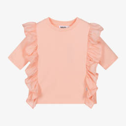 Girls black ruffle tee by Molo offers a perfect blend of comfort and elegance with its soft organic cotton jersey fabric. The lightweight voile ruffles add a touch of sophistication, ideal for both casual outings and special occasions. Designed for versatility, it pairs beautifully with skirts or trousers. Limited quantities available, making it a must-have for the stylish wardrobe.