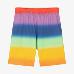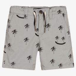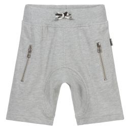 Grey jersey shorts for boys and girls from Molo, in soft, stretchy, mid-weight organic cotton. The positive words, 'You', 'Me' and 'Togetherness' are printed on one leg in the shape of a smiling face. They have an elasticated waist with inner drawstrings for the best fit and three useful pockets to complete the style.