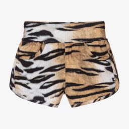 Blue swim shorts for girls by Molo, with a black jaguar print and a sun protective value of UPF 50+. Soft, silky and made from recycled bottles, they have useful front pockets and a comfortable, elasticated waistband.