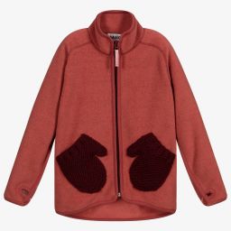 Navy blue fleece for boys and girls, by Molo. Made from soft polyester fleece, it has cute navy blue knitted mitten shaped pockets, and grey trims.