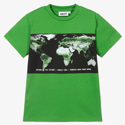 Orange T-shirt for boys by Molo, made in soft and stretchy organic cotton jersey. It has a brown and black moon landing craft print on the front, with the word 'Explorer' underneath.
