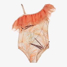 Pretty orange swimsuit for girls, by Molo. Made from Repreve® recycled lined polyester, it has a brown ombré print, with a stylish asymmetric-style organza ruffle trim.