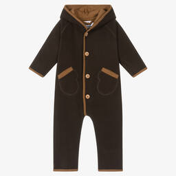 Dusky rose pink hooded pramsuit for baby girls from Danish brand Molo, made in super-soft polar fleece. Eco-conscious, this pramsuit is made with recycled polyester from plastic bottles. The sleeves and cuffs can be folded over for extra cosiness and protection from cold chills. It has piped trims, wooden button fastenings and cute mitten-shaped front pockets.