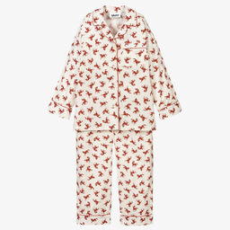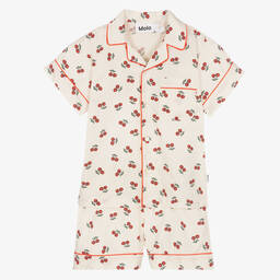 Girls pink smiling face pyjamas by Molo, made in soft and stretchy organic cotton jersey. The crew neck T-shirt features a happy face printed on the front in a trendy, white graffiti style. The matching shorts have a comfortable, elasticated waist, perfect for a restful night's sleep. Limited quantities available, last chance to buy.