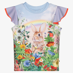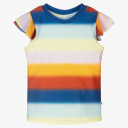Pale pink sun protective short-sleeved top for girls, by Molo. Made from Repreve® recycled polyester, it has a cool zebra wearing sunglasses printed on the front, with contrasting black and white zebra-print flutter sleeves. Can also be worn when swimming.