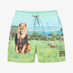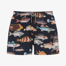 Swim shorts for teen boys by Molo, with a cool fade effect in navy blue, yellow and orange and a surf-themed logo on the front. Made from recycled material with sun protection of UPF50+, they have a soft mesh lining and a black rubberised logo badge on the back. They have an elasticated waist with drawstring ties for comfortable wear.