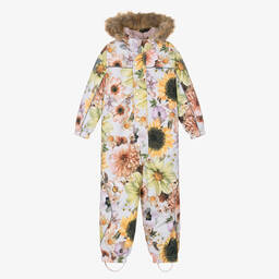A green snowsuit for teen boys by Molo, with a logo label on the front. Patterned with dinosaur graphics, this cool one-piece is sure to make that all-important statement on the slopes. The technical fabric boasts waterproof and windproof qualities for warmth and comfort. With reflective trims, it has mid-weight padding, flap-over pockets and a removable velcro hood with a detachable faux fur trim. Lined in polar fleece and silky fabric, there are internal elasticated shoulder straps and stirrups that attach to the ankles with buttons. It has a front zip with a gold-tone branded popper placket over the top for added protection from the elements. The outer fabric, lining and filling are made with recycled materials.