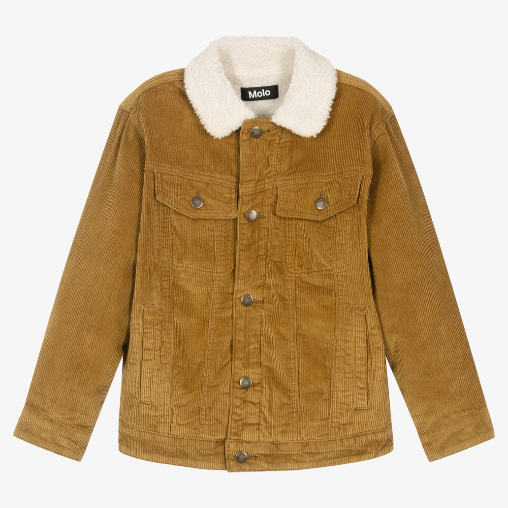Khaki green cotton corduroy jacket for teen boys by Molo. With 70s styling, this jacket is lined and features a collar in faux shearling for a retro look. There are four useful front pockets, metal front button fastenings. The designer's logo patch can be found on the back hem.