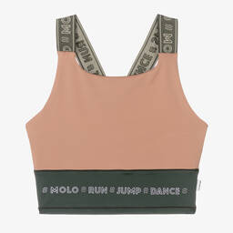 Beige and rose pink cropped sports top for teen girls by Molo, patterned in a lovely a tie dye print. Made from soft recycled technical jersey, it has green elasticated logo straps and a small logo tab on one side. Designed to keep you cool when active, the fabric is moisture-wicking, with a lightweight perforated lining for added support and comfort.