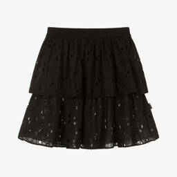 Casual and comfy for teen girls, this green tiered layered skirt is by Molo. It is made in lightweight cotton, with lovely broderie anglaise detailing. There is an elasticated waistband for easy pull on, with a branded tab on the side seam for a designer touch.