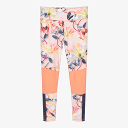 Sporty orange ombré leggings for teen girls, by Danish brand Molo, made from silky, stretchy technical polyester to keep you cool during sports. They have a logo tab on the back, a colourful spray effect and orange contrasting panels.