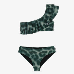 A stylish bikini for teen girls from Danish brand Molo, in an orange, purple and blue ombré effect with silhouettes of the sun. This silky smooth bikini is designed with one shoulder strap with a layered ruffle for modern, asymmetrical style. With a sun protective factor of UPF 50+, both pieces are fully lined for comfort and modesty. This item is made with recycled material.
