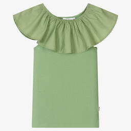 Rose pink top for teen girls by Danish brand Molo, with a contrast poplin ruffle across the chest and shoulders. Made from soft organic cotton jersey, this finely ribbed top has a racer-style back and a gently elasticated neckline for casual comfort. The black and white logo tab on the side seam discreetly signifies the brand.