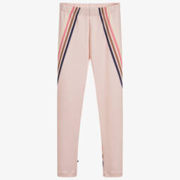 Teen girls activewear leggings by Molo, with ivory and brown leopard print panels, deep orange logo tape on the sides, and light brown knee patches. Silky and stretchy, the polyester fabric has Heiq Smart Temp technology that reacts to body temperature and perspiration to keep you cool and comfortable.