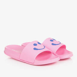 A cool look for the poolside, beach or resort, these mint green sliders for teen boys and girls are from Danish designer, Molo. A distinctive style, they are detailed with a dark green smiling face motif on the rubber strap and a logo print on the textured insole. Created with a moulded footbed for comfort, these waterproof sandals have a textured outer sole.