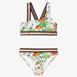 Asymmetric orange bikini for teen girls, by Danish brand Molo, with UPF 50+ sun protection. Made from Repreve® recycled polyester and fully lined, it has a colourful tropical palm leaf print, with rust orange and sparkly gold striped elasticated trims.