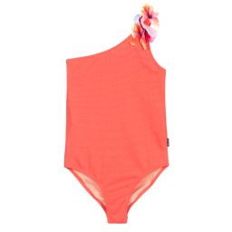 A ivory, pink and gold floral swimsuit for teen girls by Molo, with a UPF factor of 50+. The soft and stretchy lycra is made from recycled plastic bottles. In a one-shouldered style, the strap is decorated with a pink floral appliqué.