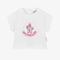 Essential white T-shirt for baby girls, by luxury French brand Moncler Enfant. Made in soft cotton jersey, it has a pastel coloured logo print on the front and back, the iconic felt logo badge on one sleeve, and popper fastenings on one shoulder.
