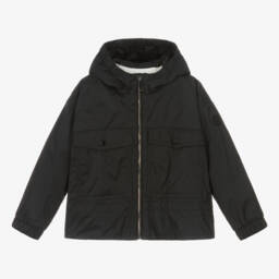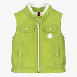 Black down-padded gilet jacket for little boys by luxury French brand Moncler Enfant. It is made in water-repellent lightweight nylon and is fully lined with soft cotton for added comfort. The detachable hood is in contrasting white for a classic monochrome finish. There is a textile logo on the chest and it fastens with an exposed zip.