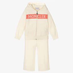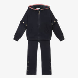 Mid-blue tracksuit for little boys by luxury brand Moncler Enfant, made in soft cotton jersey, with a warm, fleecy inside. The top has a navy blue, white and red tricolour logo print across the front and the brand's signature felted logo patch on one sleeve. It has ribbed trims and useful popper fastenings on one shoulder to help with dressing. The matching joggers have a logo tab on the back of the comfortable elasticated waistband.