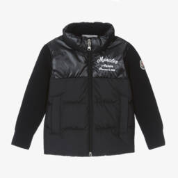 Navy blue cardigan for little boys by luxury brand Moncler Enfant, made in a ribbed virgin wool knit and enhanced with a down-padded front. A combination of textures, this warm layer has a front zip fastening, two front pockets and a gently padded collar. A Moncler Archive logo is embroidered on the chest and the iconic felt logo patch is sewn on the sleeve.