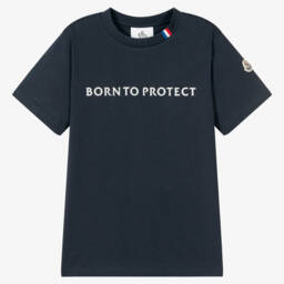 A navy blue long-sleeved T-shirt for boys by luxury brand Moncler Enfant, made in soft cotton jersey. This casual tee has the designer's distinctive logo embossed on the chest and their signature logo badge sewn on the sleeve.