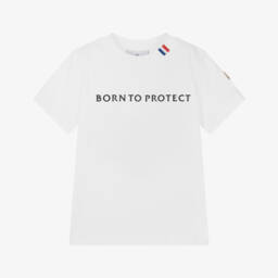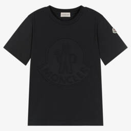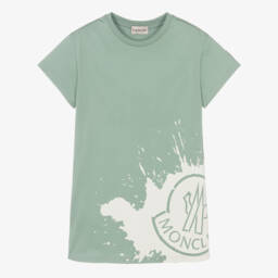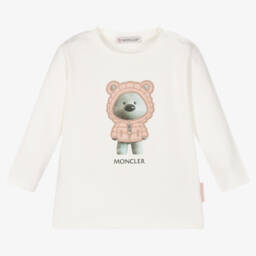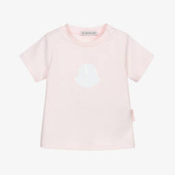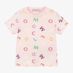Pink T-shirt for little girls by luxury French brand Moncler Enfant, made in soft cotton jersey. Fastening with poppers on one shoulder, it has a pink, white and black patterned logo print on the front and a logo tab on the side seam.