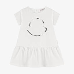 Little girls red, down padded dress by Moncler Enfant. Silky and lightweight, this warm and lightweight design is super warm and comfortable to wear. It has a front taped zip, with chin guard and a white logo print. The inside is lined in soft cotton jersey.