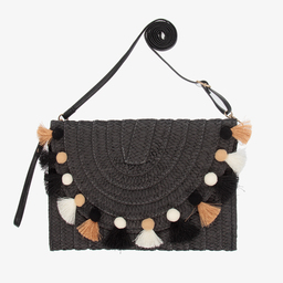 Beige straw bag for girls by Italian designer Monnalisa, decorated with colourful pom-poms and tassels. It has a front flap which fastens with a popper and a silky lining with a small inner side pocket. There is an attached faux leather hand strap and a matching detachable shoulder strap.