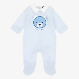 An ivory teddy bear sleepsuit for boys by Monnalisa, crafted in soft cotton jersey. It features a charming beige and Navy Blue teddy bear pattern with a matching collar design. Popper fastenings on the front and between the legs allow for effortless changing. Limited quantities available, making it a lovely choice for cosy nights and playful days.