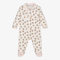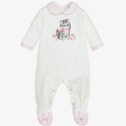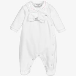 The boys white cotton babygrow by Monnalisa features a charming whale motif in blue on the front, complemented by blue gingham trims on the collar and feet. Made from soft cotton jersey, it ensures comfort and cosiness. The designer's name is embroidered on one sleeve, adding a subtle touch of elegance. Perfect for everyday wear, popper fastenings ensure easy dressing. Last chance to buy with limited quantities available.