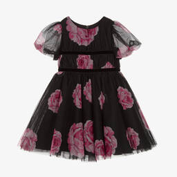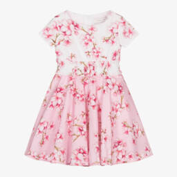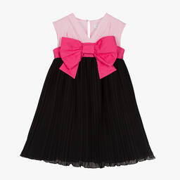Dainty white, beige and black polka dot dress for girls by Italian designer Monnalisa. Made and lined in soft cotton voile, this tiered dress drapes elegantly below the knee to create a flowy, feminine silhouette. It has ornamental bows appliquéd to the straps and intricate shirring at the back.
