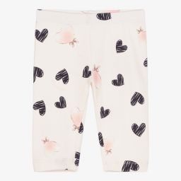 Navy blue leggings for little girls by Monnalisa, made in soft cotton jersey. They are printed with pink hearts and pink heart-shaped balloons.