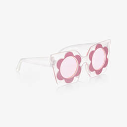 Girls blue square sunglasses by luxury designer Monnalisa. The clear matte frame has fun blue flowers bordering the blue tinted, round UV protective lenses. They are presented in a blue polka dot and floral patterned, branded protective carry case.