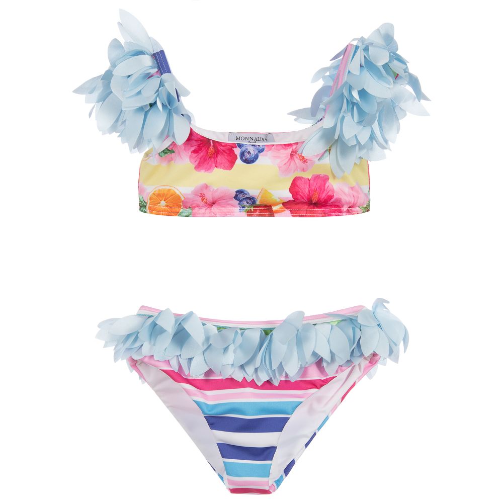A colourful bikini for girls by Monnalisa, in stripes of pink, blue and yellow. Soft, stretchy and fully lined, the top has a floral and fruit print, and both pieces have a pretty pale blue fabric flower trim.