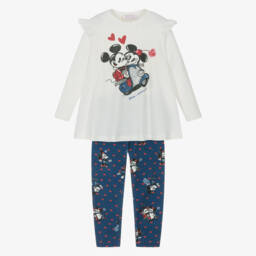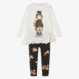 Girls ivory and blue leggings set by Monnalisa features a charming long-sleeved top adorned with a delicate house motif and a playful peplum hem. Crafted with soft fabric, the set includes floral-patterned leggings that provide comfort and style for everyday adventures. Perfect for autumn and winter seasons, this outfit ensures warmth while offering easy wearability. Limited quantities are available, making it a last chance to buy this delightful ensemble for a special little one.