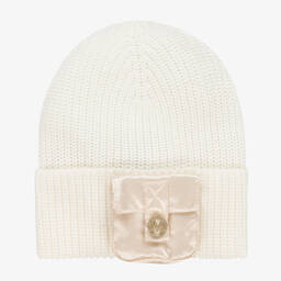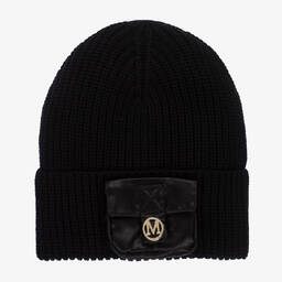 Stylish knitted red-orange beanie hat for girls by Monnalisa. It has a unique satin pocket on the turned-up brim, styled with a sparkling gold and silver diamanté 'M' logo charm for added glamour.