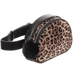 Girls red leopard print handbag that converts into a belt bag, by Monnalisa. Made in soft velvet, it has a leather hand strap and a detachable, adjustable leather belt with a buckle. The zip fastening is trimmed with a black mink fur pom-pom.